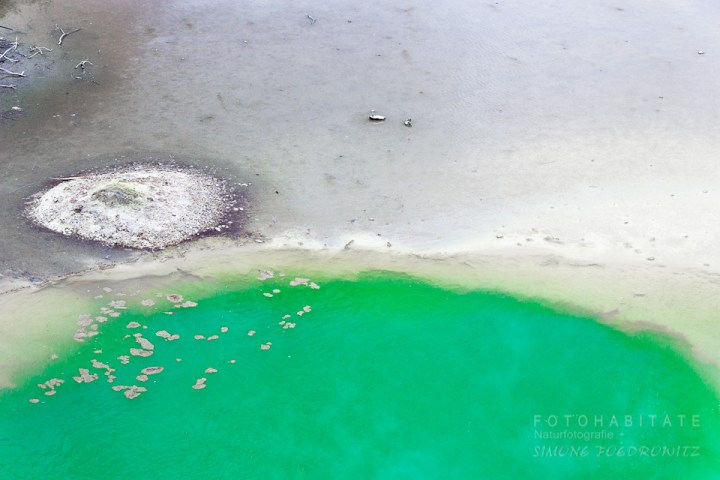 Vom Aussichtsbalkon führt ein Holzweg durch die Artist’s Palette vorbei zum Champagne Pool. Unterwegs veränderte sich das Bild stetig. Der blaue Himmel und die weißen Wolken schienen in der feuchtnassen Ebene zu versinken.