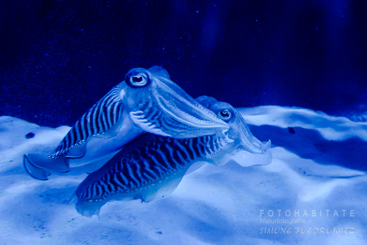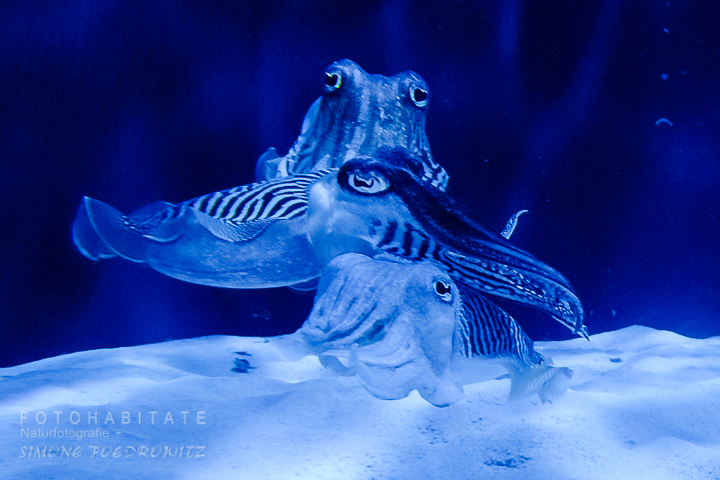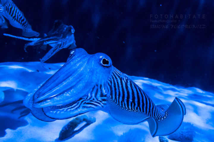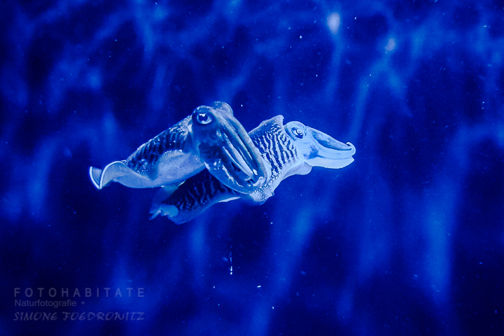 The light in the wonderful aquarium of Mallorca immersed the cuttlefish (Sepia officinalis) in a deep blue, ink blue. I could not turn my eyes away from this fascinating creature, which – I admit it – formerly has been on my plate from time to time..
