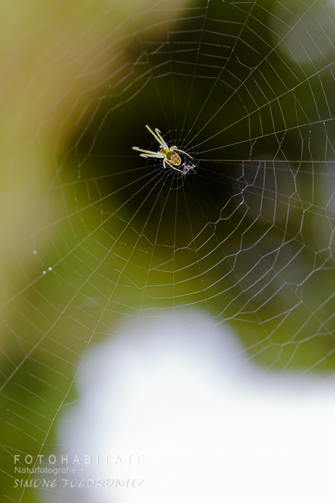 A yellow black striped body. In the animal kingdom, this clearly means: „Don’t come too close to me, I can defend myself well“. A completely superfluous warning for me with eight-legged animals. I never going to cozy up to them! 🙂 But the spider apparently floating in the air had even more defense strategy in store. In fact a small, grim face at the rear part of the abdomen looked at me.