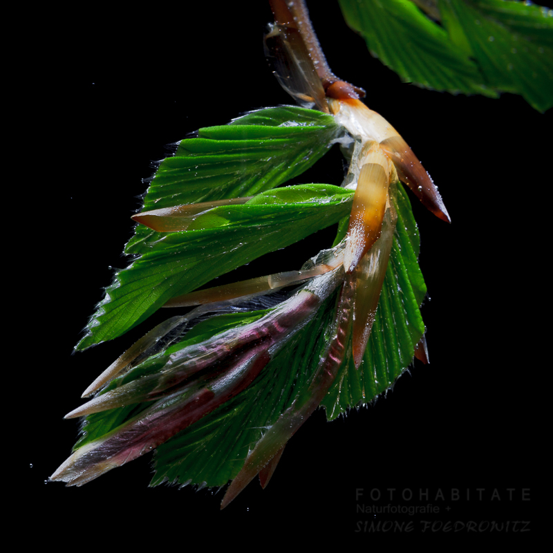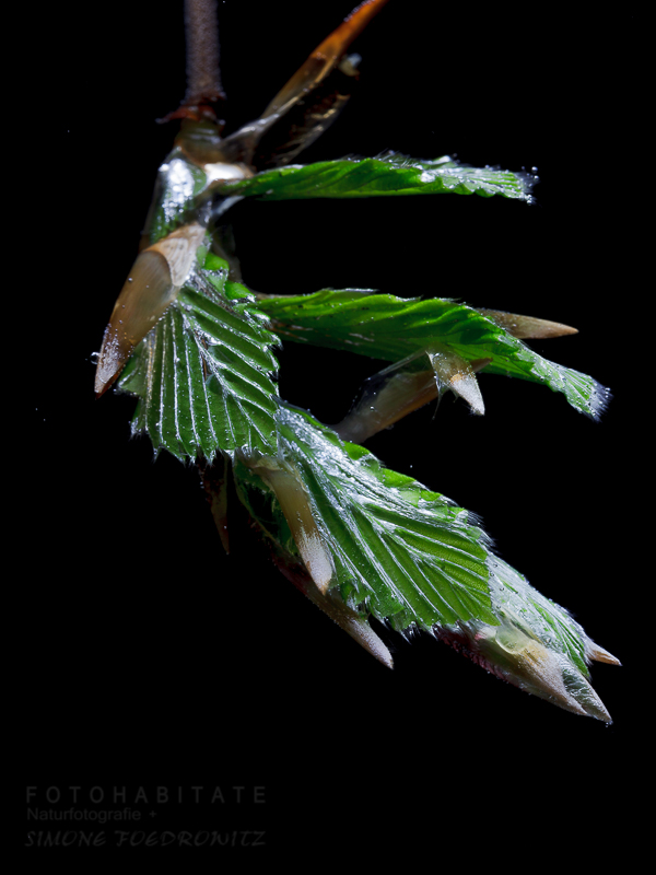 Und nein, das Setting habe ich für meine ersten beiden Fotos dort nicht abgekupfert. 😉 Ist Zufall. Ich musste selber grinsen. Mein Zweig lag abgerissen am Waldboden. Also mitgenommen, gekürzt und dann komplett in ein Wasserglas getaucht. Manch einer wird die Luftblasen entdeckt haben. Dahinter war ein recht dunkler Hintergrund, den ich bei der RAW-Entwicklung dann noch zusätzlich ein wenig abgedunkelt habe.
