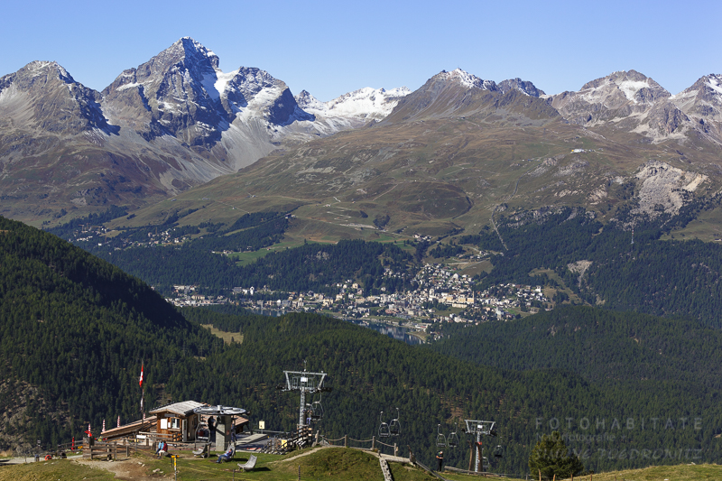 Die Sessellift-Bergstation in 2.330 Metern Höhe mit besten Blick auf Sankt Moritz.