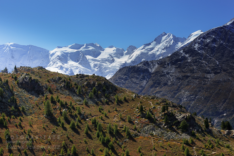 Hoch oben rechts neben dem Gipfel thront die Chamanna Georgy. Doch hier ist eher schweißtreibendes Bergsteigen als genussvolles Paradieswandern angesagt. 🙂