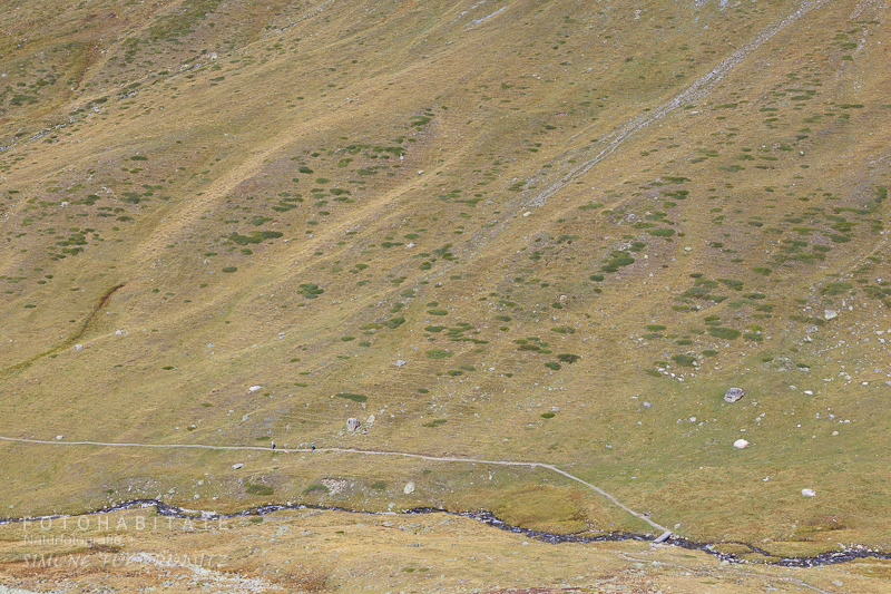 Der Südhang mit den meisten Murmeltieren. Winzig klein zu sehen: Zwei Wanderer auf dem Pfad.
