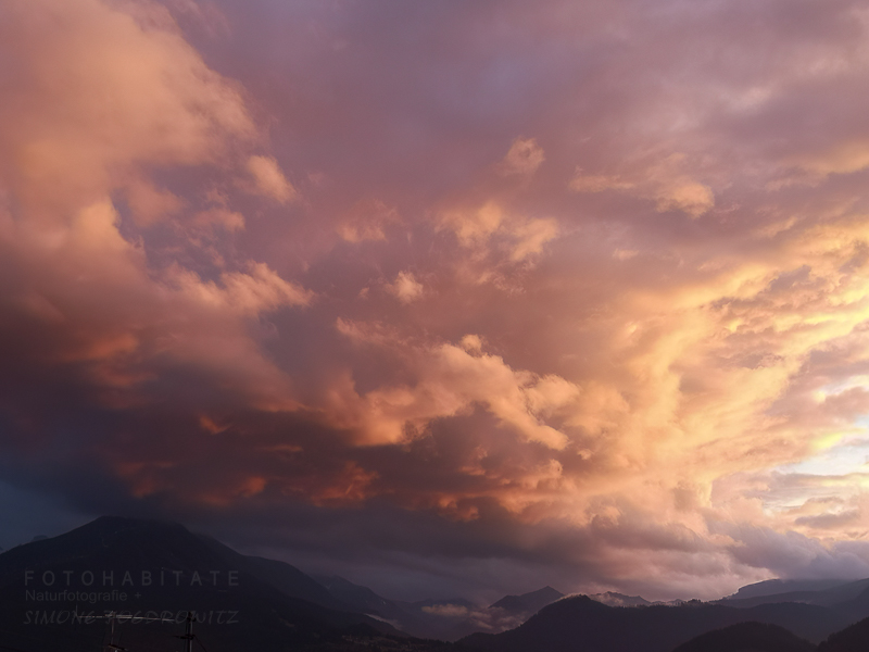 Oberstdorf/Reichenbach: Normalerweise veröffentliche ich nicht so oft Sonnenuntergänge. Aber dieser hier über den Allgäuer Bergen war nicht nur unglaublich dramatisch, sondern zeigt auch, welch starke Wirkung das Sonnenlicht hat. Denn nur neun Minuten später präsentierte sich eine ganz andere Szenerie, die eher an einen Vulkanausbruch erinnerte …